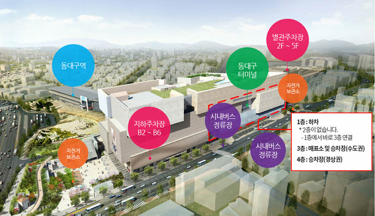 그리고 지하 1층은 대구 도시철도 1호선의 동대구역 연결통로가 있으며, 1층과 2층에서는 하차와 수화물 센터를 중심으로 구성되어 있습니다.