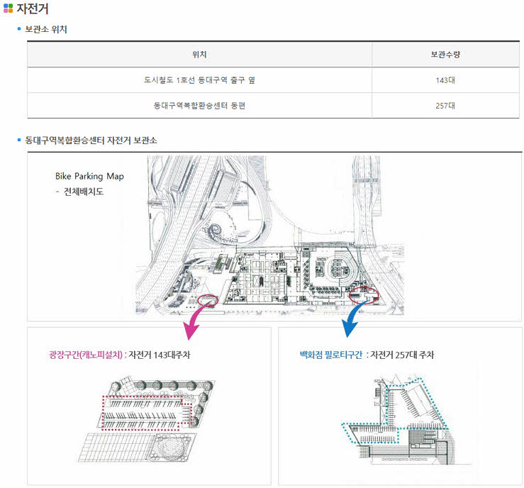 도시철도 1호선 동대구역 출구 옆에는 총 143대의 자전거를 주차할 수 있으며, 환승센터 동편에는 총 257대를 주차가능하죠.