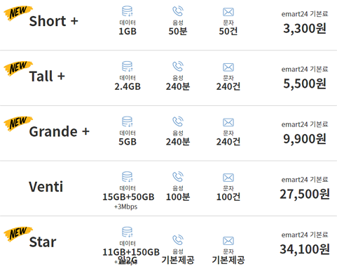 이것은 음성 100분에 데이터 15GB 기본제공 + 추가요금없이 매월 데이터 50GB, 2년동안 추가제공 + 데이터 모두 소진 시 3Mbps로 이용이 가능한데요. 이마트24 기본요금은 월 27,500원이며 제휴카드로 결제 시 22,000원에 이용이 가능합니다.