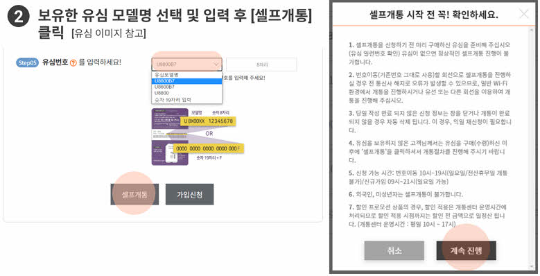 그 후 유심번호를 입력하고 셀프개통 진행 전 유의사항을 확인하면 되는데요.